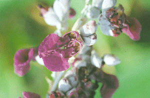 โดยมี 1 กลีบที่ยื่นออกมาเป็นปาก ขนาดประมาณ 2 เซนติเมตร อีก 2 กลีบมีขนาดเล็กกว่าอยู่ภายในดอก